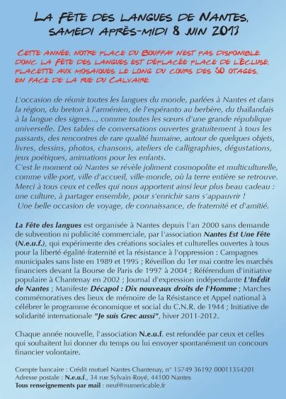 Sabaton, la 8an de Junio je la 2a posttagmeze, okazos placon de la Kluzo en Nanto la jara « Festo de la lingvoj », organizata de la asocio N.E.U.F. (Nantes Est Une Fête).